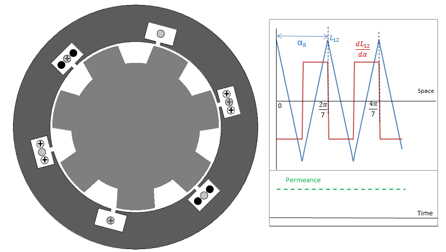 The electromechanical energy conversion is due to the variations in the mutual-inductance L12 of the two windings as the toothed rotor rotates relative to them. variations of self-inductances are of secondary importance, although this change might be even higher than the mutual-inductance. Like singly-excited machines, one cycle of the change in the mutual-inductance is completed as the rotor rotates through one tooth pitch.